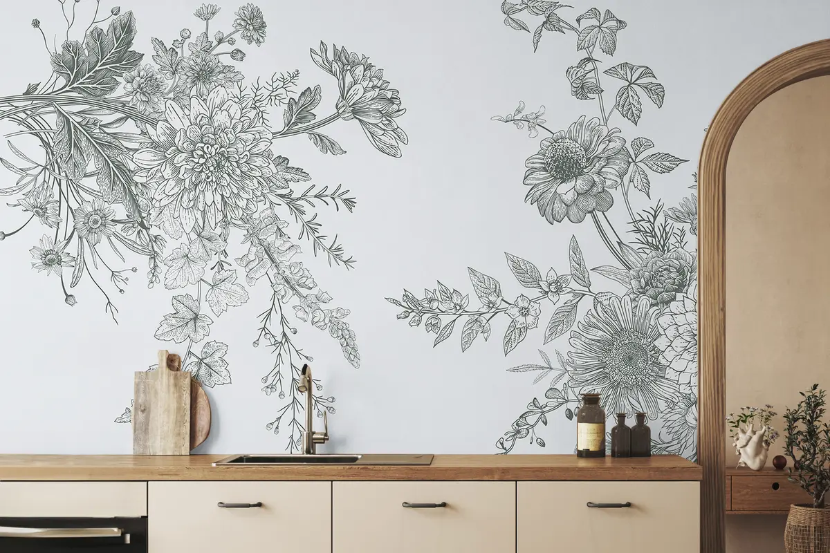 Fototapety Kvetinový ornament, minimalizmus, line art, boho štýl, rustikálny, pivonka, sedmokráska, modré farby, lúka Nr. w00381v3