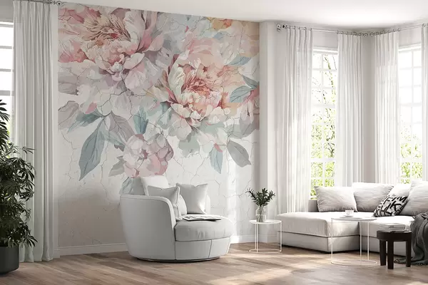 Fototapety Kytica veľkých, jemných pastelových ružových a bielych kvetov pivonky so zelenými listami na svetlom pozadí Nr. w00896