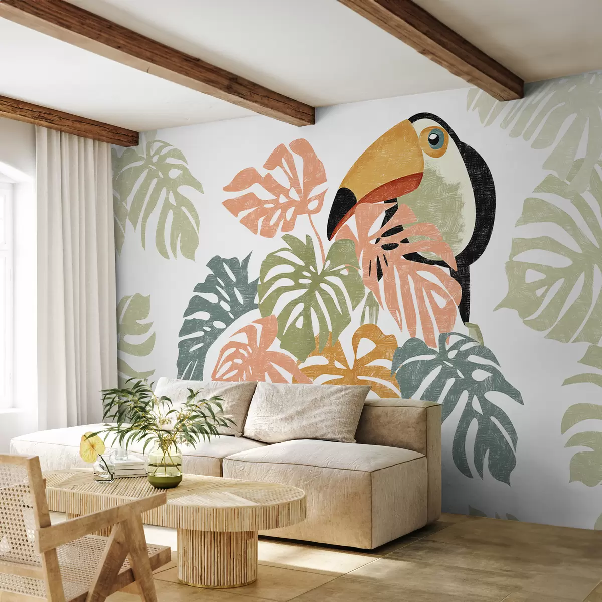 Fototapety Tukan sedí v listoch tropického monstera, kresba imitujúca ťah Nr. w01009