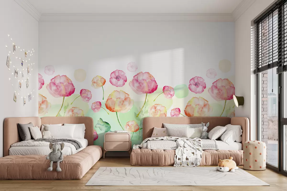 Fototapety červeno-oranžové a ružové tulipány v akvarelovej technike na bielom podklade so zelenými škvrnami Nr. w01028