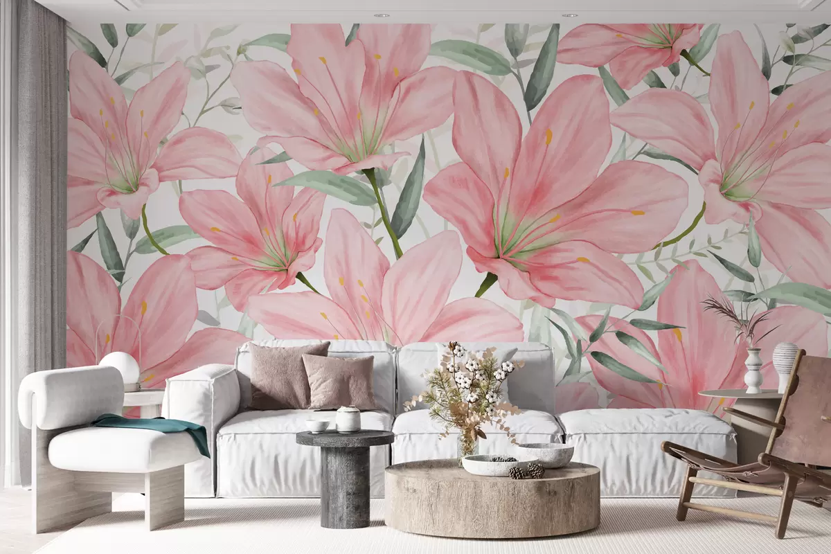 Fototapety Veľké bledoružové ľalie a listy v akvarelovom štýle na bielom pozadí Nr. w01121