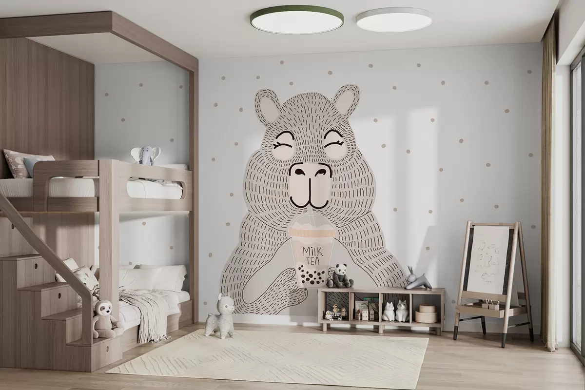 Fototapety Veľká roztomilá béžová kapybara s bublinkovým tričkom v štýle minimalistickej pomlčky na bielom bodkovanom pozadí Nr. w01122