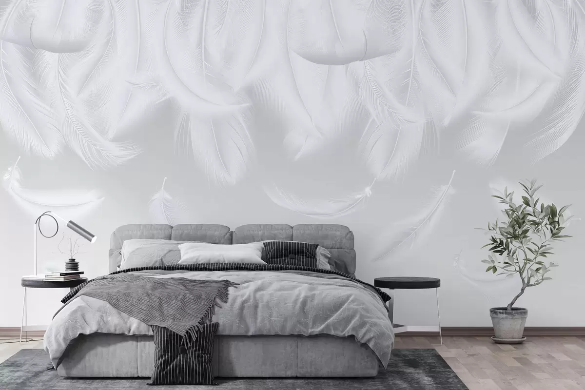 Fototapety Jemné biele pierka padajúce zhora na teplom sivom pozadí Nr. w01150