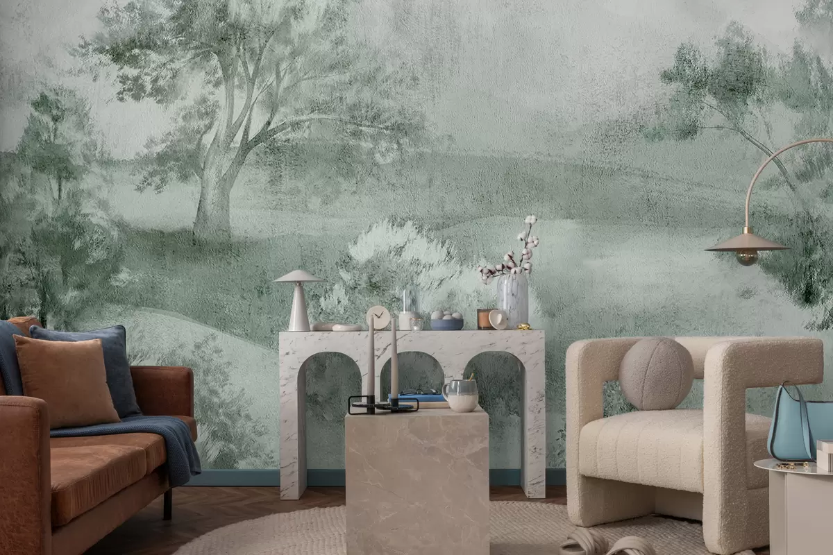 Fototapety Krajinná maľba zahmlenej vidieckej scény obklopenej sviežimi stromami a listami v odtieňoch modrej Nr. w01247v2