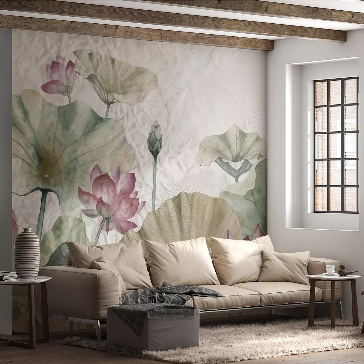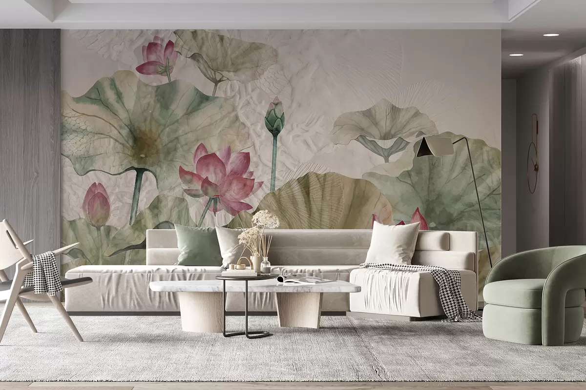 Fototapety Ružové lotosové kvety so zelenými listami na svetlom textúrovanom pozadí Nr. w01248