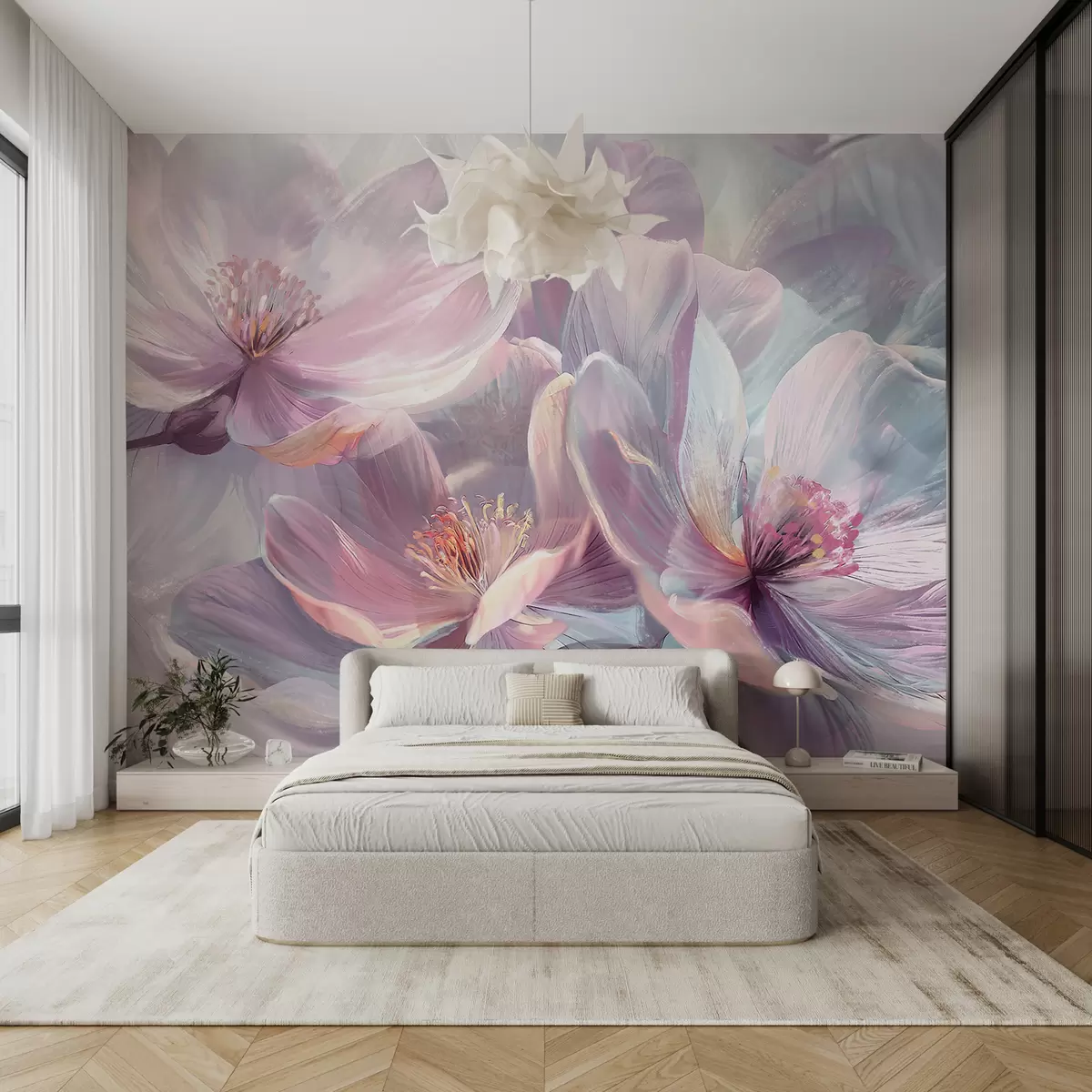 Fototapety Jemné priehľadné pastelové neónové svetloružové a biele kvety s jemným rozostreným pozadím Nr. w01307