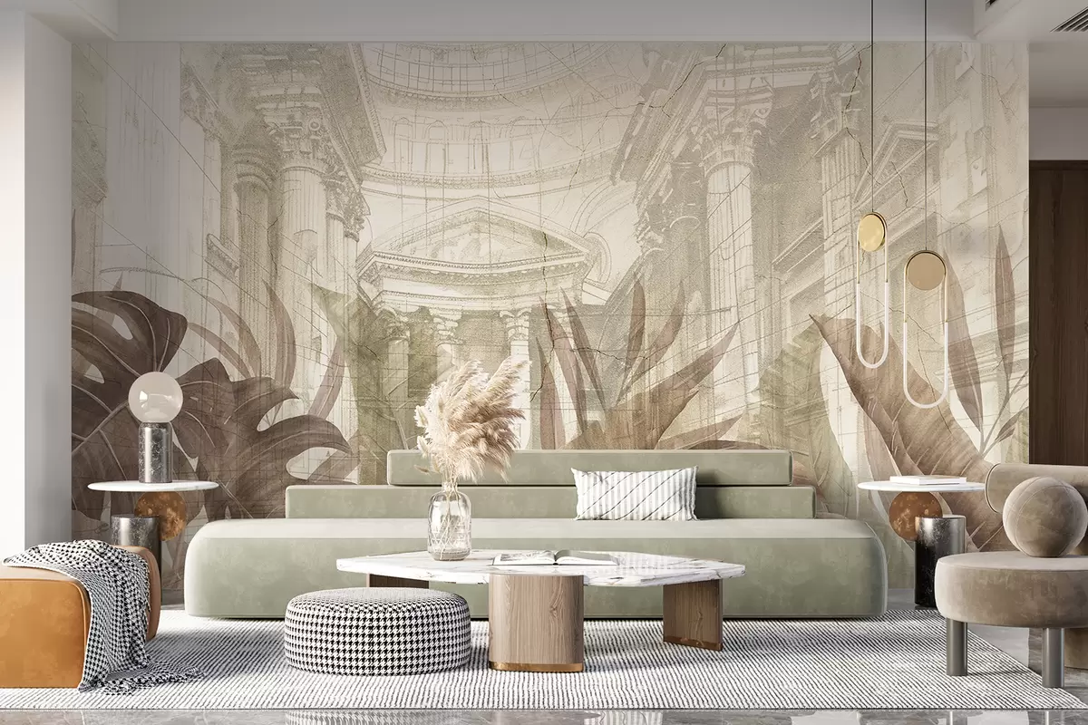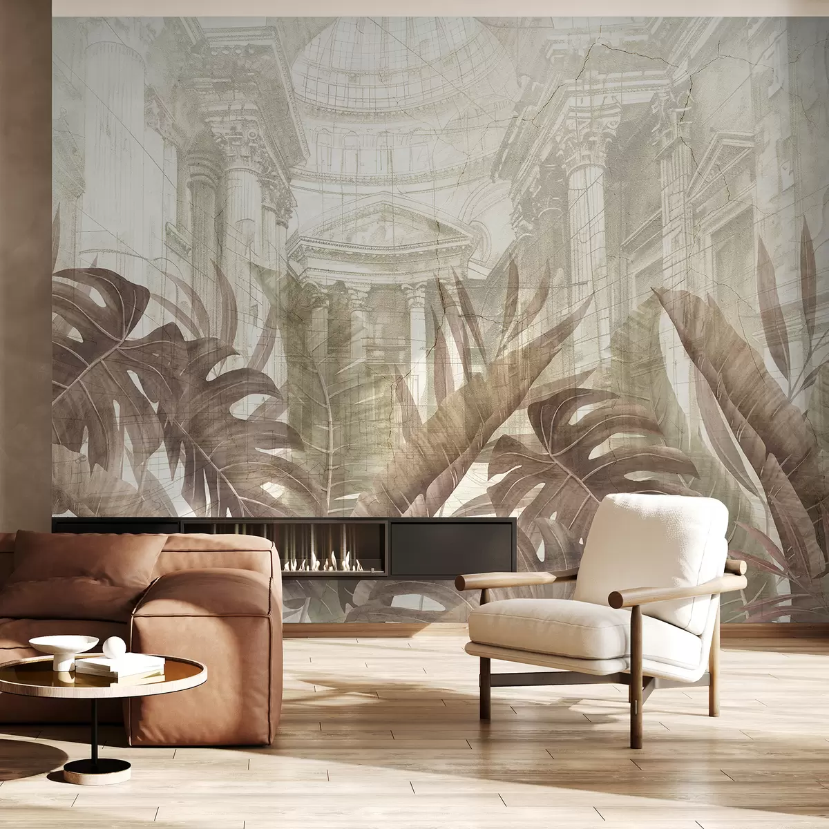 Fototapety Veľkolepé kresby zdobené architektonickými mramorovými stĺpmi a sviežimi tropickými sépiovými rastlinami Nr. w01311v1