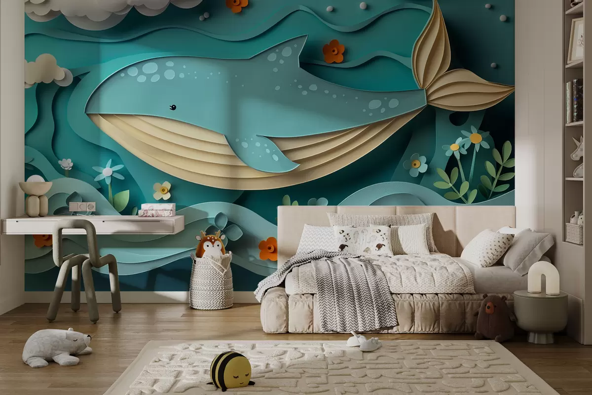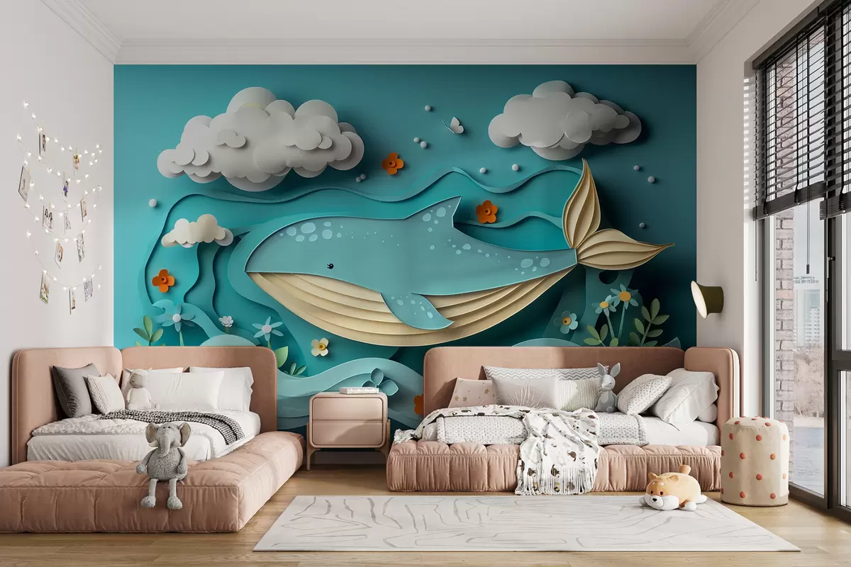 Fototapety Hravá veľryba v oblakoch v štýle papierového rezu, 3D efekt Nr. w01496
