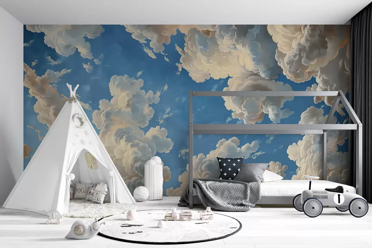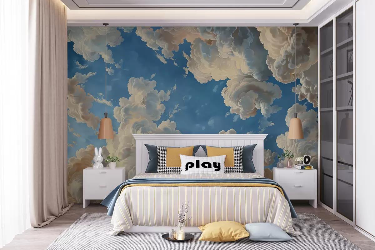Fototapety Oblaky v teplých tónoch krémovej, jemnej broskyňovej a bledo farby na pozadí hlbokej, žiarivo modrej oblohy Nr. w01583