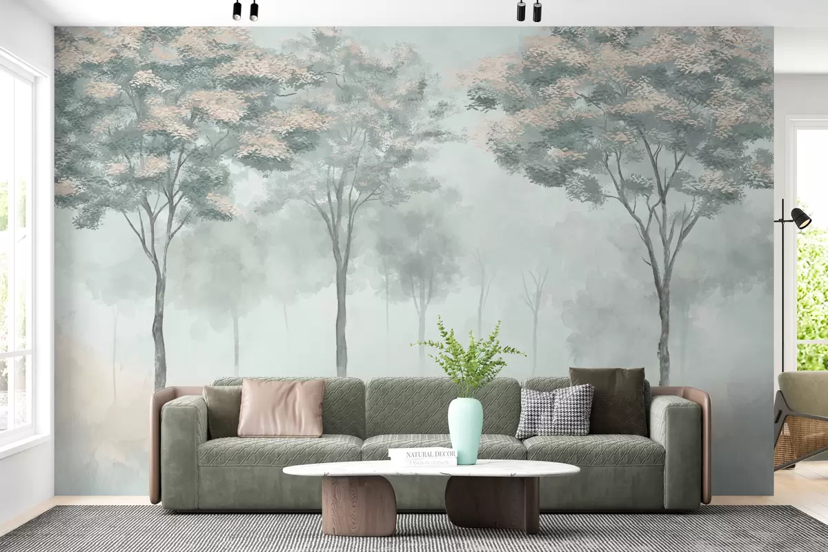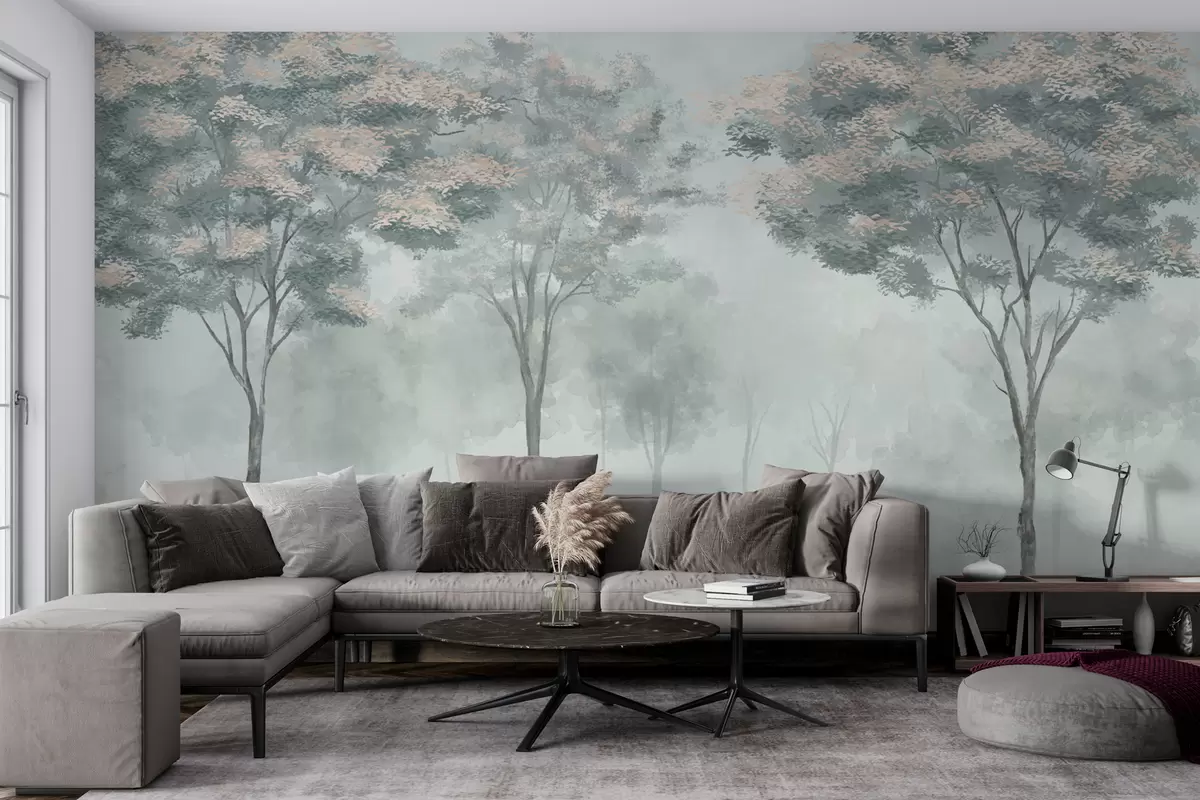 Fototapety Hmlistá silueta lesa v zelenej, svetlosivej a béžovej farbe Nr. w01599