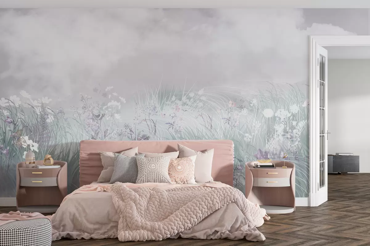 Fototapety Divoké kvety a trávy s ružovkastou oblohou a mrakmi Nr. w01624v1