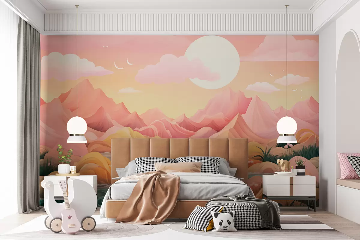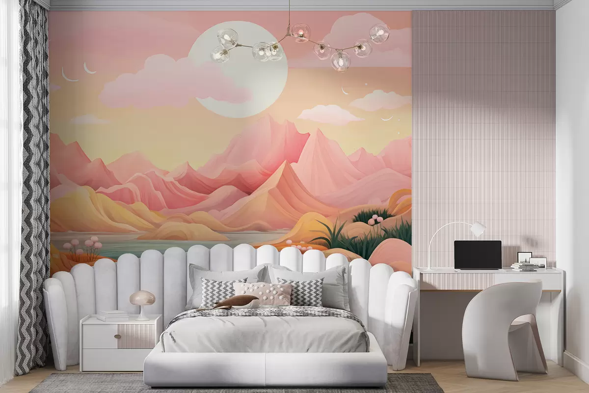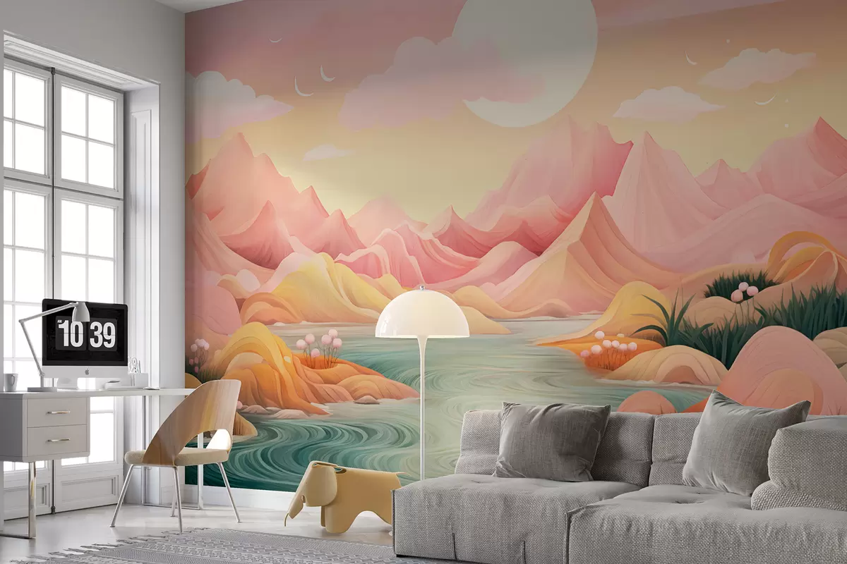 Fototapety Fantastická, pastelovo sfarbená krajina s jemnými ružovými a broskyňovými horami Nr. w01656
