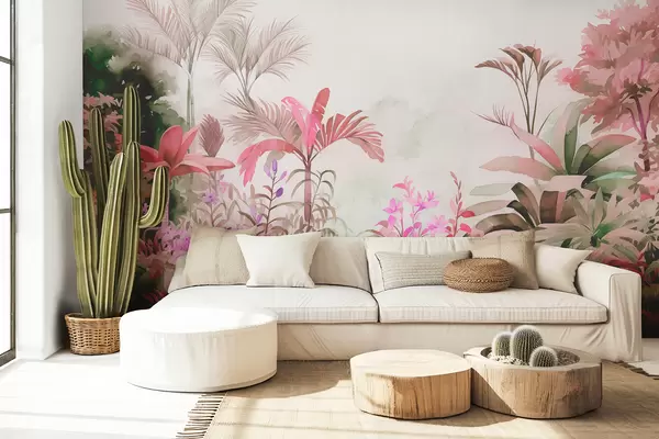 Fototapety Džungľa les, akvarel, palmy, kvetinové, ružové farby Nr. w01785v1