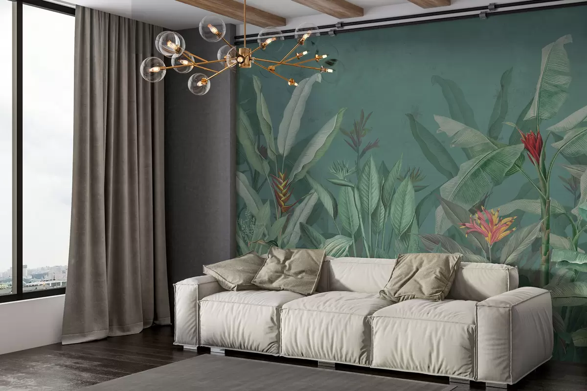 Fototapety Tropické listy a kvety na zelenom pozadí Nr. w01834v2