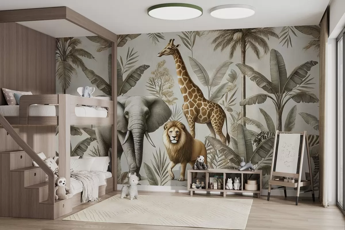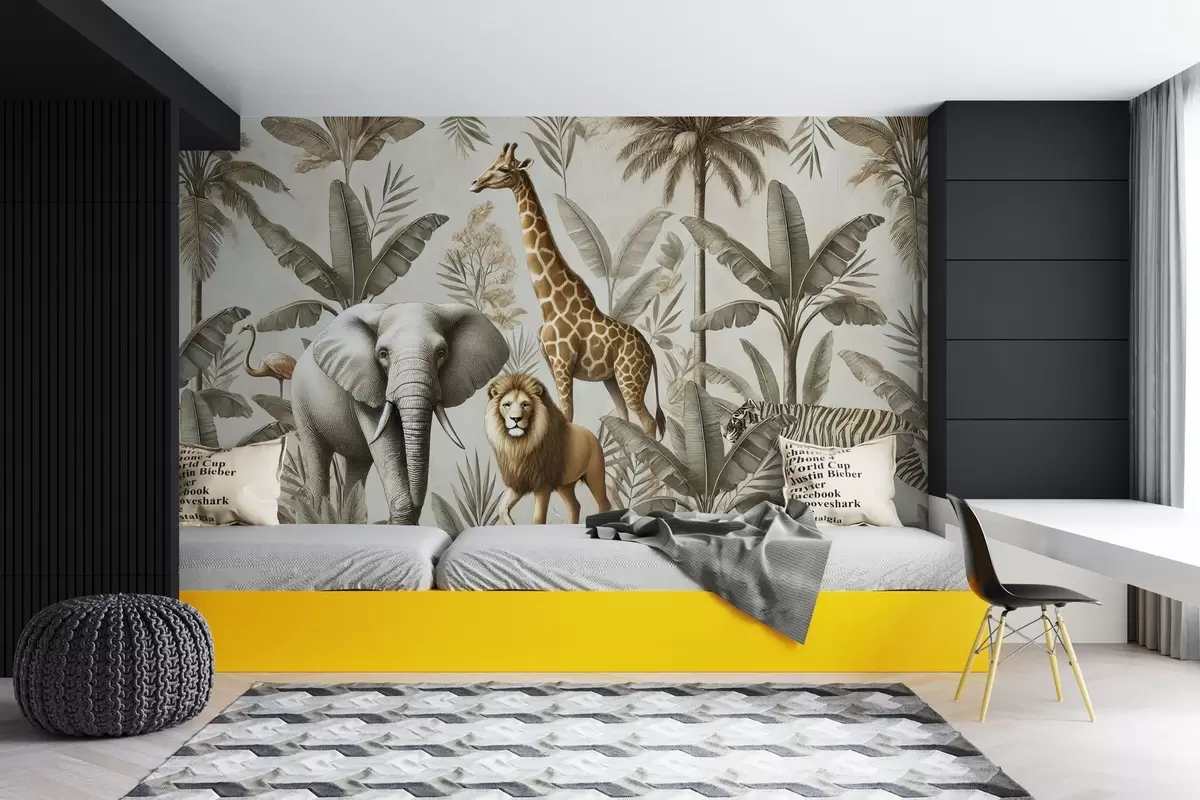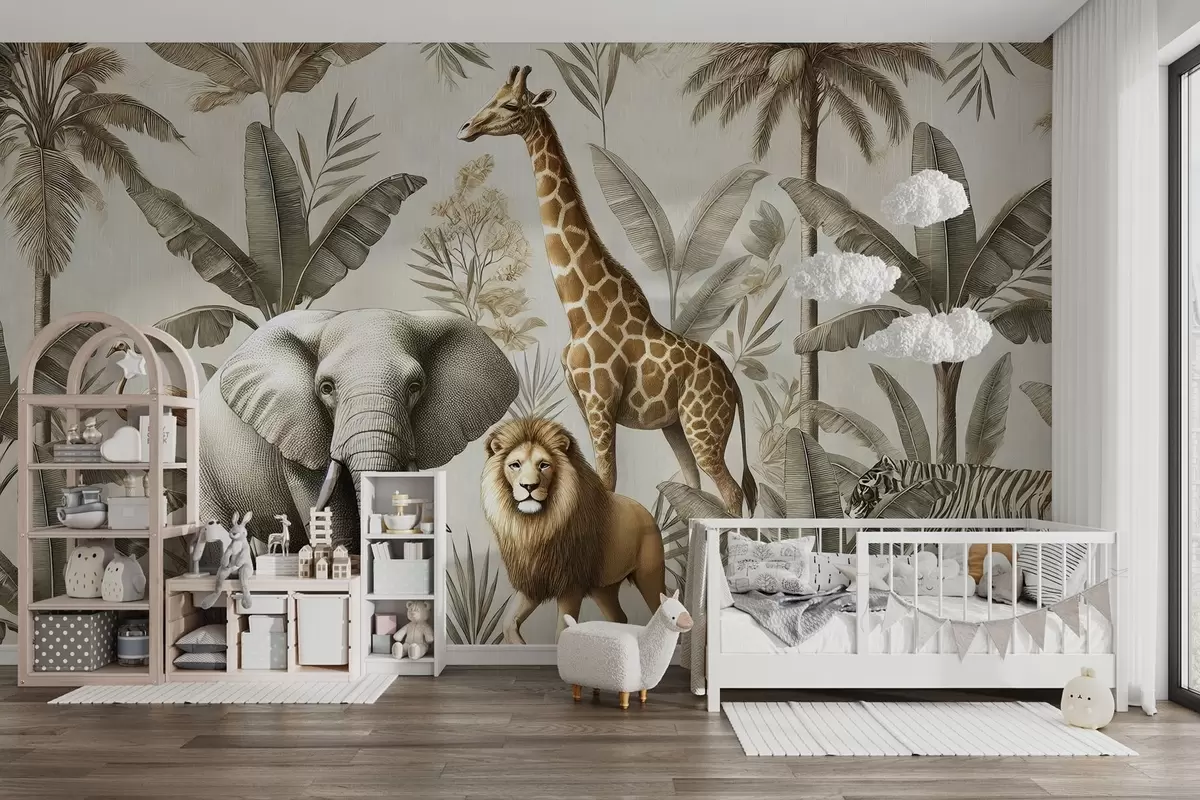 Fototapety Detské tapety Safari s tropickou krajinou a rôznymi zvieratami v elegantných farbách Nr. w01956