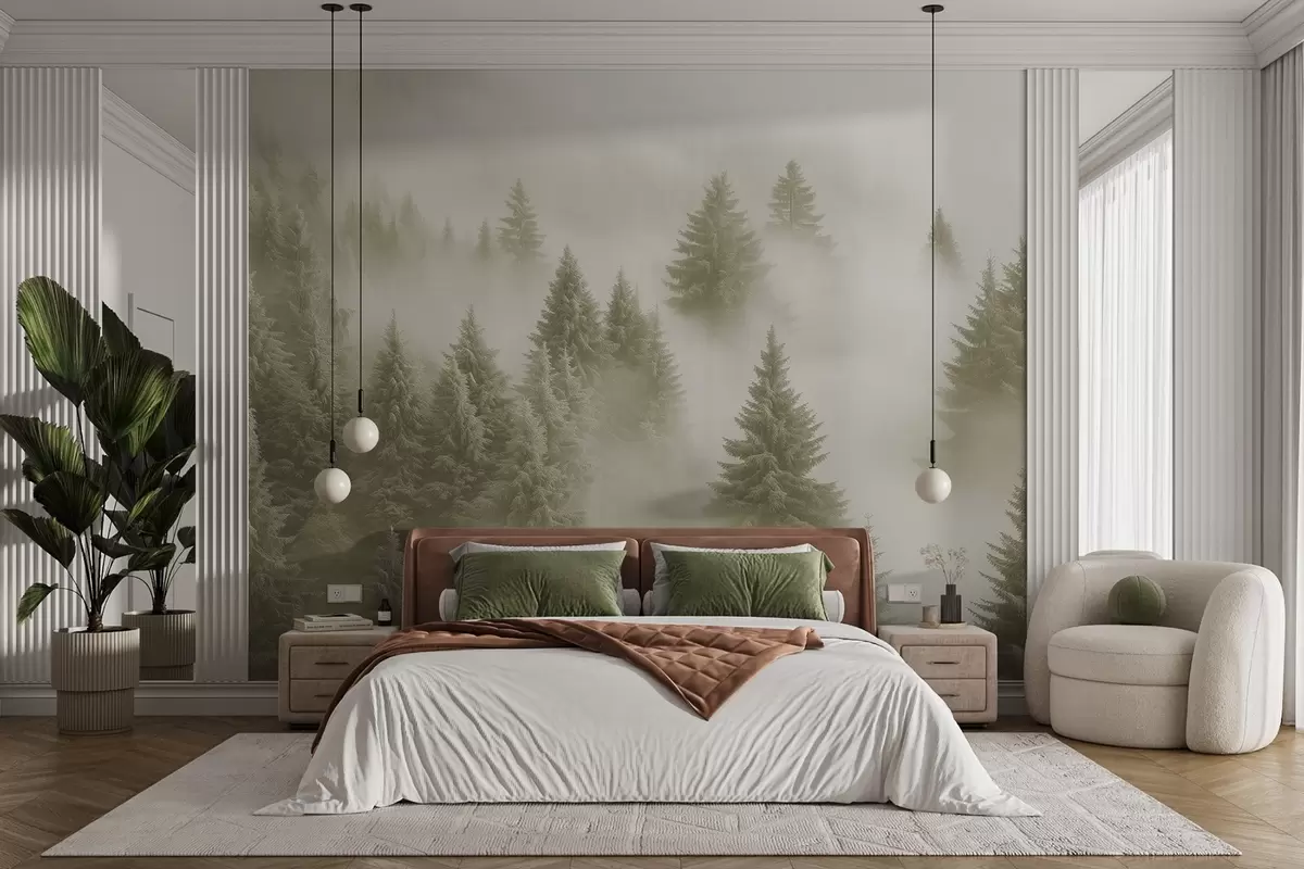 Fototapety Hustá hmla zahaľujúca zasnežený ranný les v jemných zelených odtieňoch Nr. w02064v2