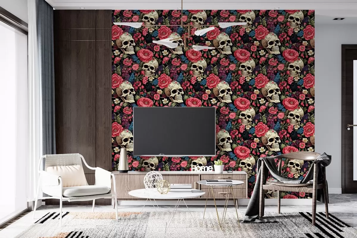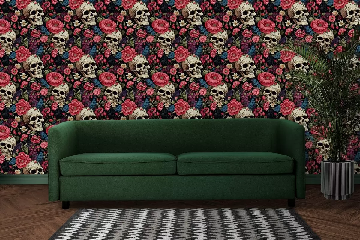 Fototapety Mystický retro štýl tapety so vzorom lebky a kvetov v ružových tónoch na tmavom pozadí Nr. w02084