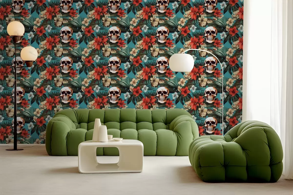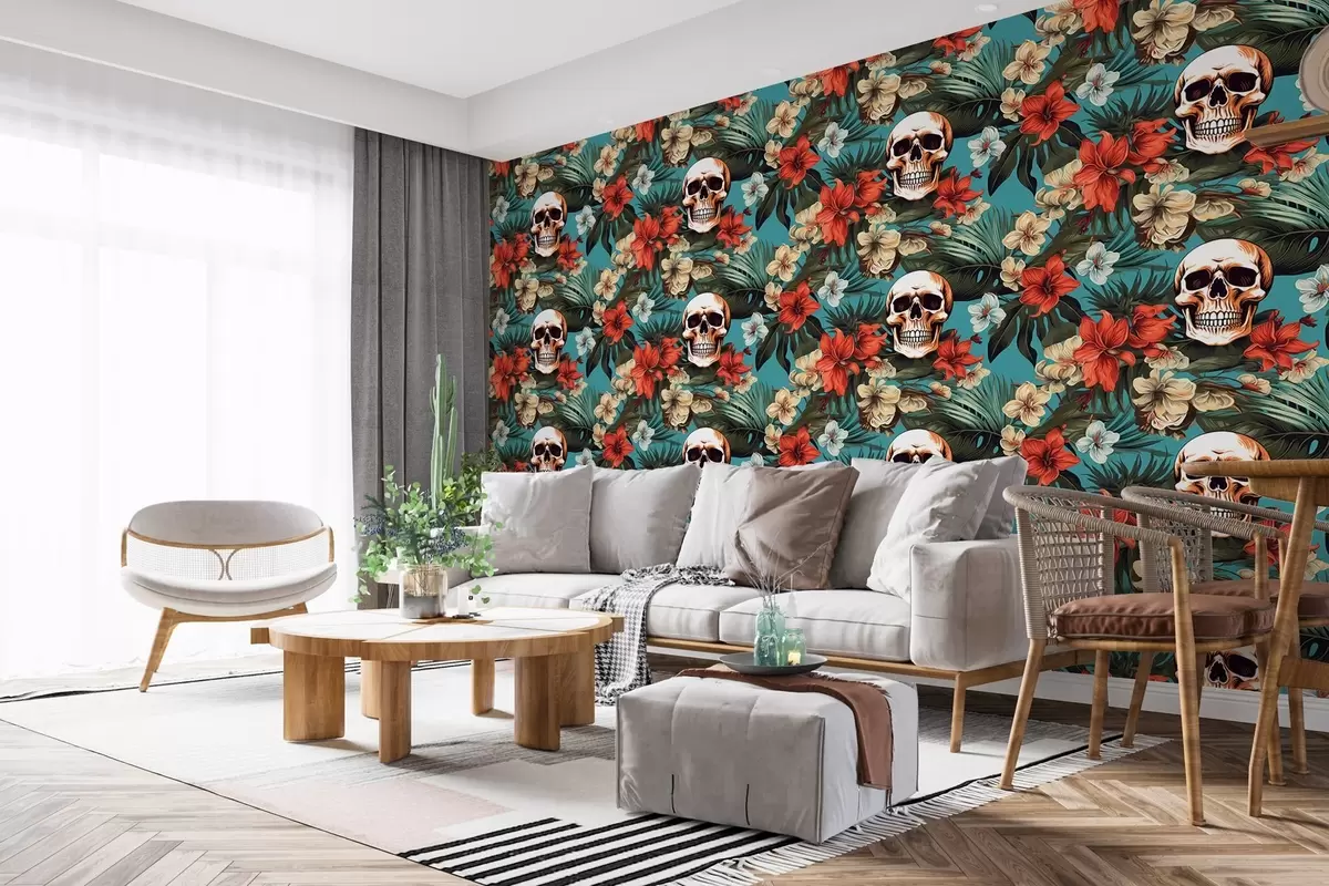 Fototapety Vzor v tropických rohožiach s kvetmi a lebkami Nr. w02122