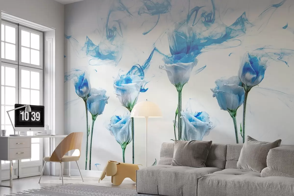 Fototapety Biele ruže pod vodou na bielom pozadí s modrými pruhmi akrylovej farby. Nr. w02139
