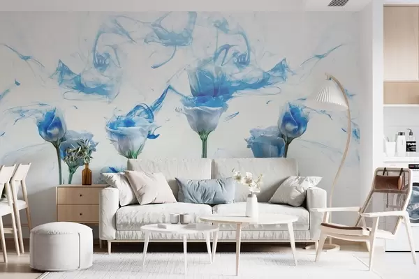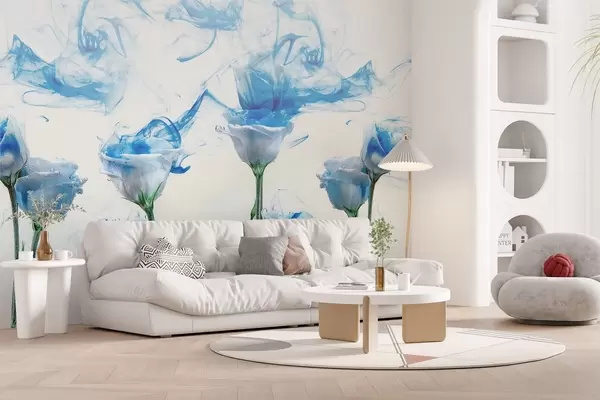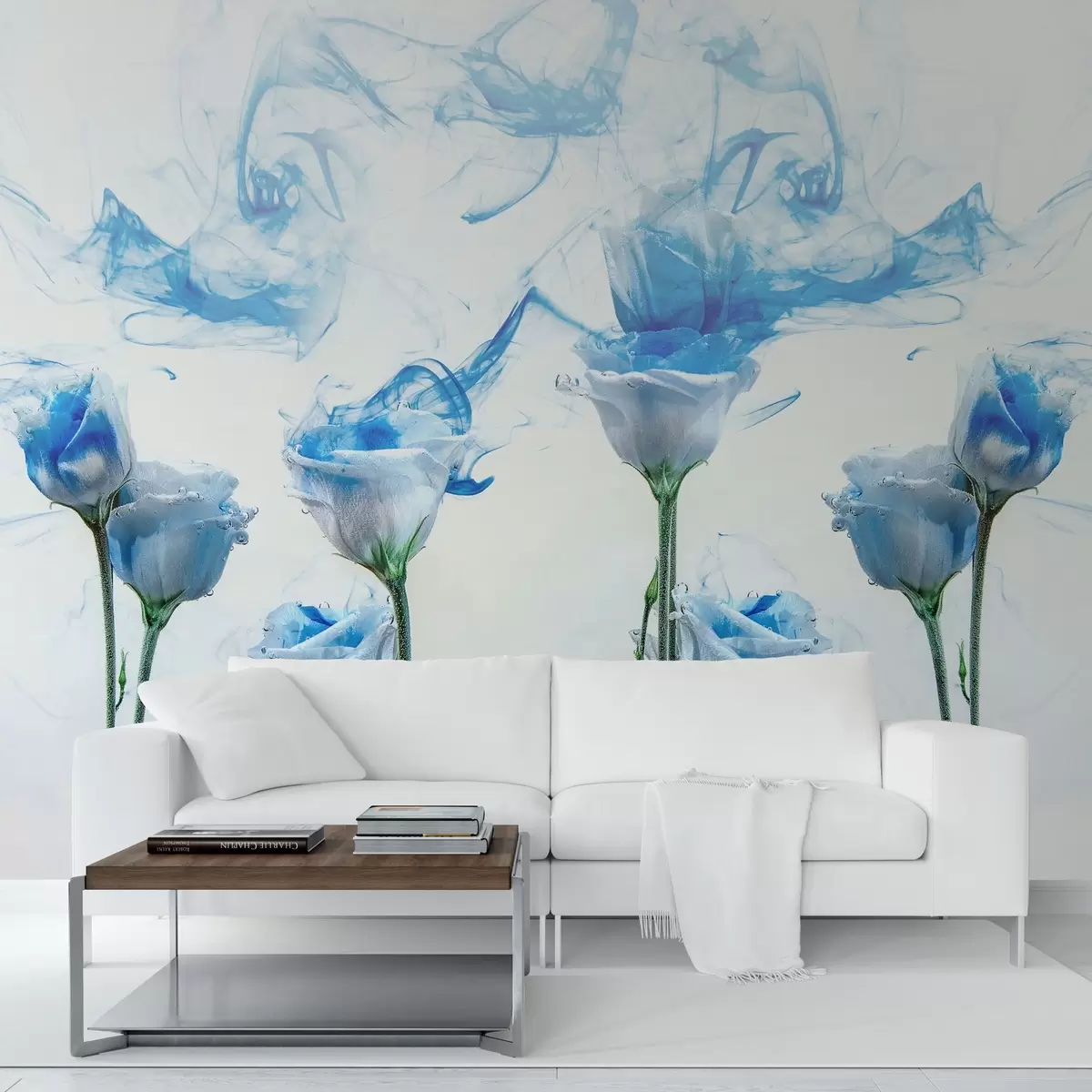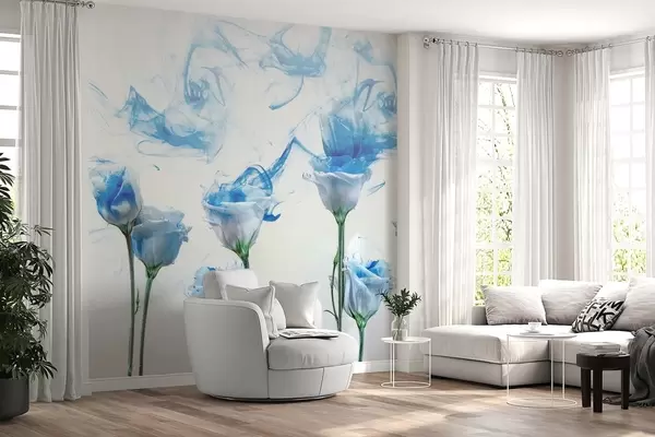 Fototapety Biele ruže pod vodou na bielom pozadí s modrými pruhmi akrylovej farby. Nr. w02139