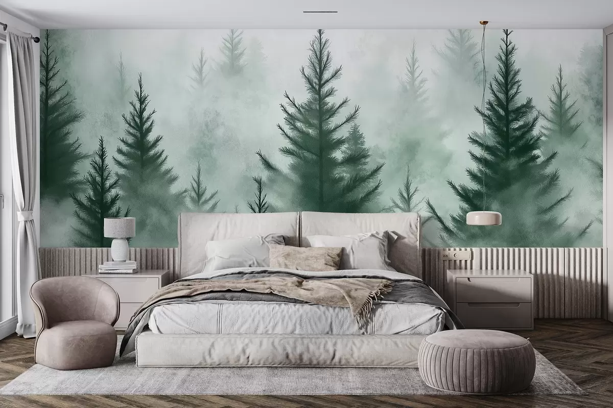 Fototapety Les v hmle, borovice, akvarel, zelené farby Nr. w02152v1