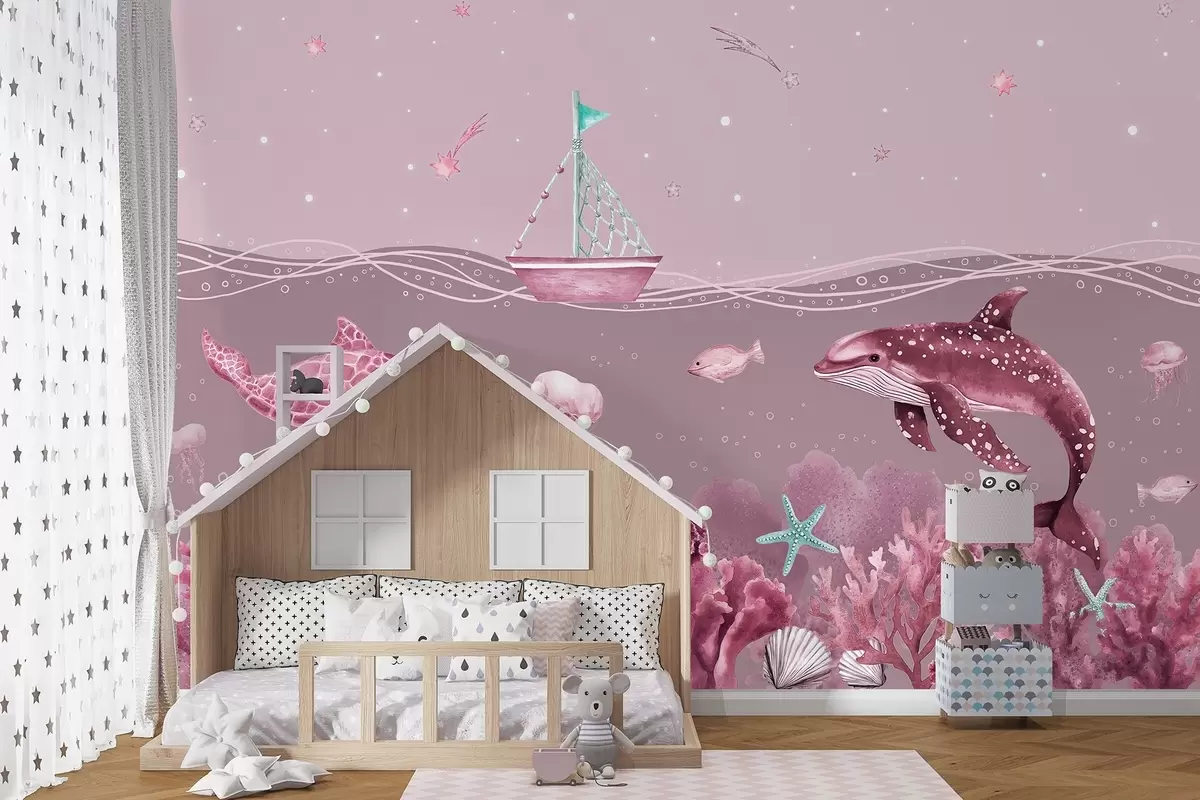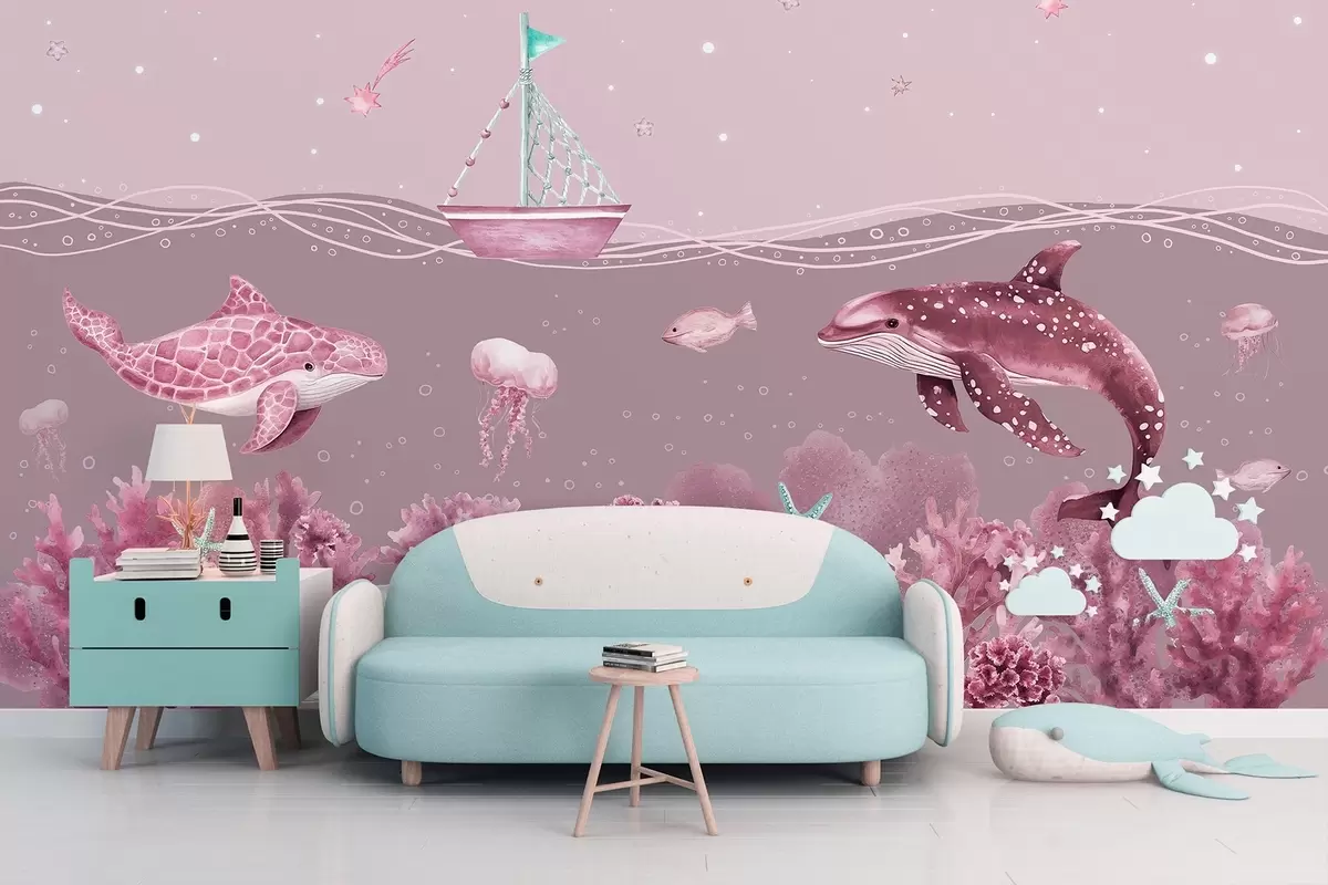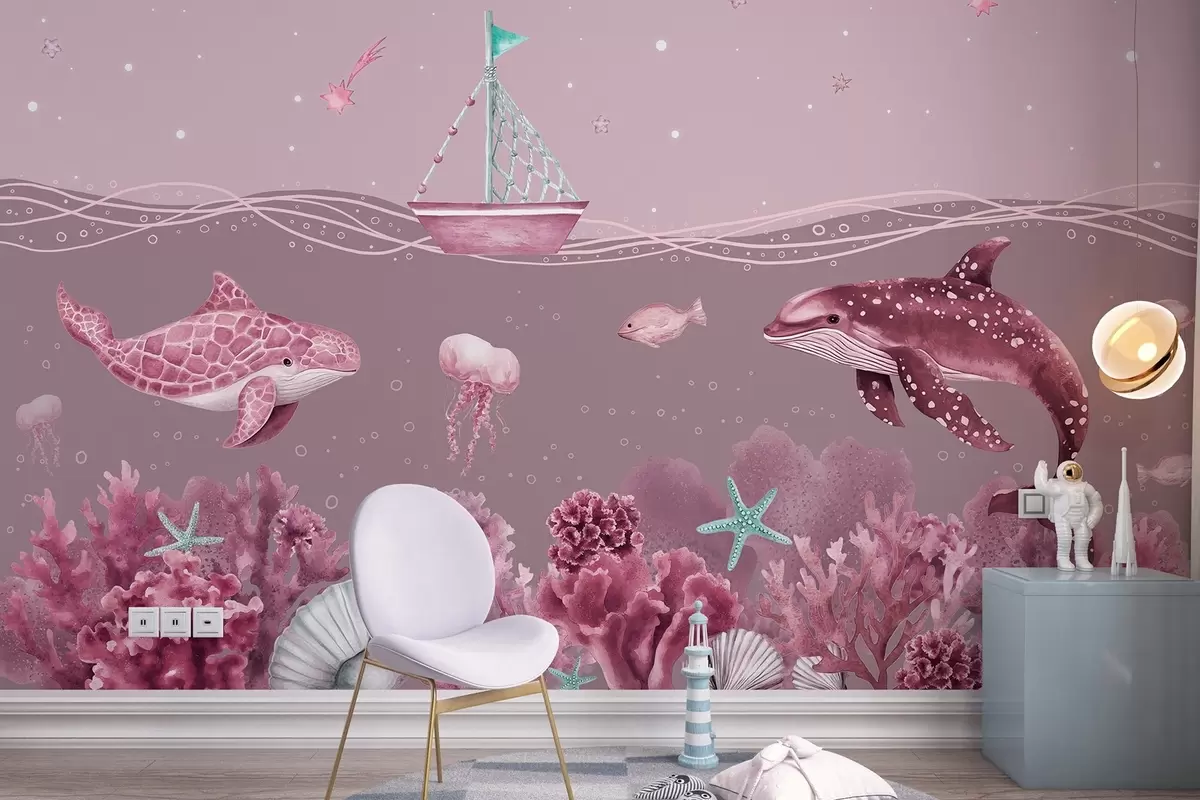 Fototapety Morský život, akvarel, koraly, loď, delfín, medúzy, hviezdna obloha, ružové farby Nr. w02310v2