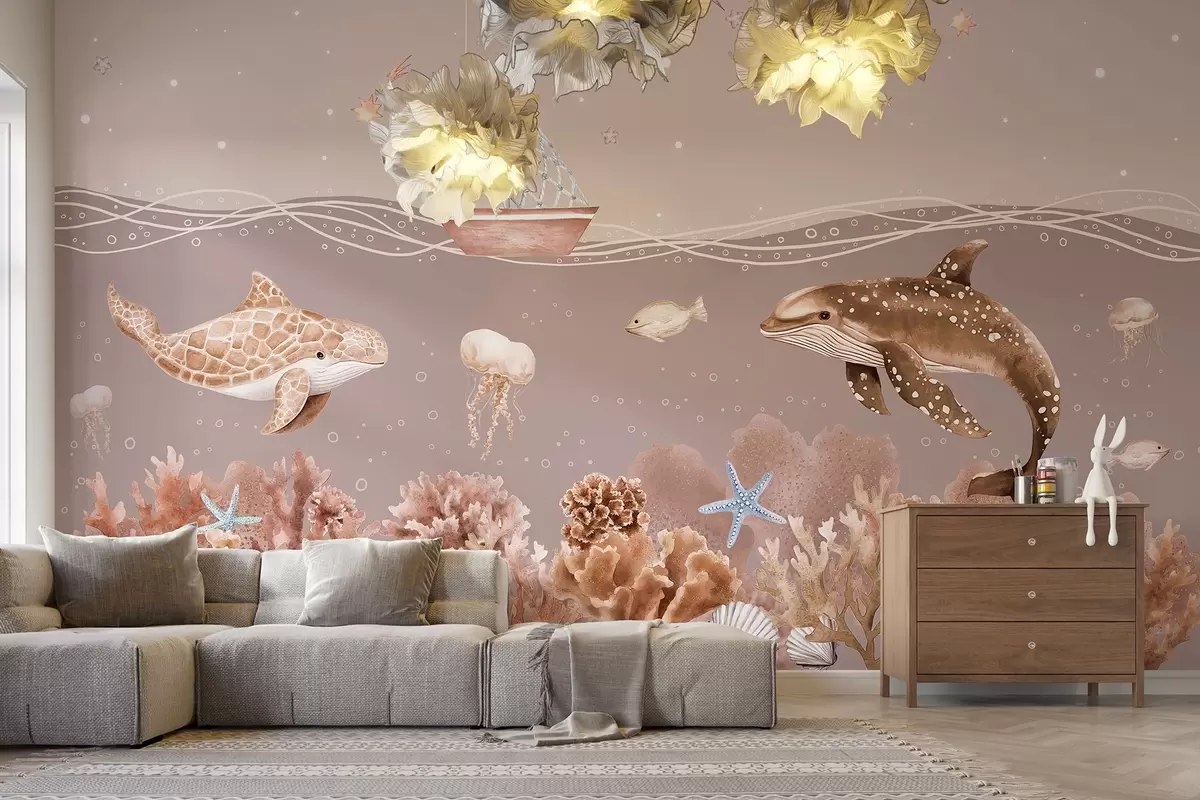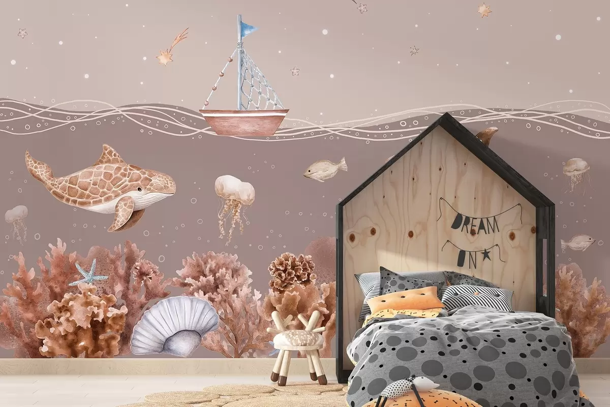 Fototapety Morský život, akvarel, koraly, loď, delfín, medúzy, hviezdna obloha, béžové farby Nr. w02310v4