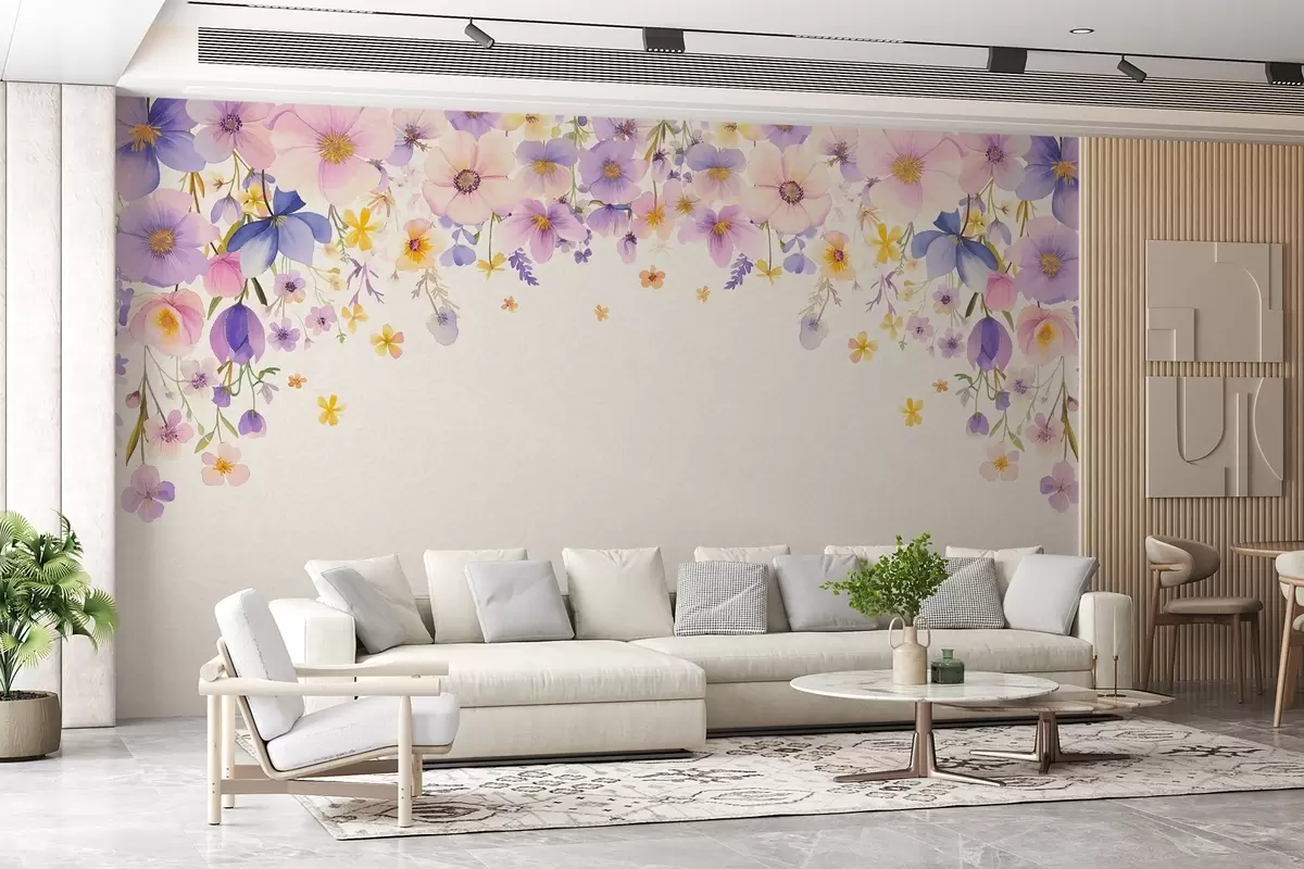 Fototapety Jemné kvetinové aranžmá s akvarelovými kvetmi v jemných pastelových odtieňoch ružovej, fialovej a žltej. Kvety jemne kaskádovito klesajú zhora a zanechávajú pod sebou svetlé vzorované pozadie. Nr. w02345