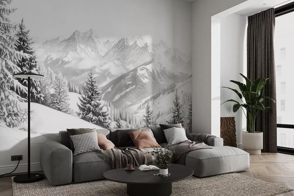 Fototapety Zima v horách, les, Alpy, kresba ceruzkou, prírodné scenérie Nr. w02353