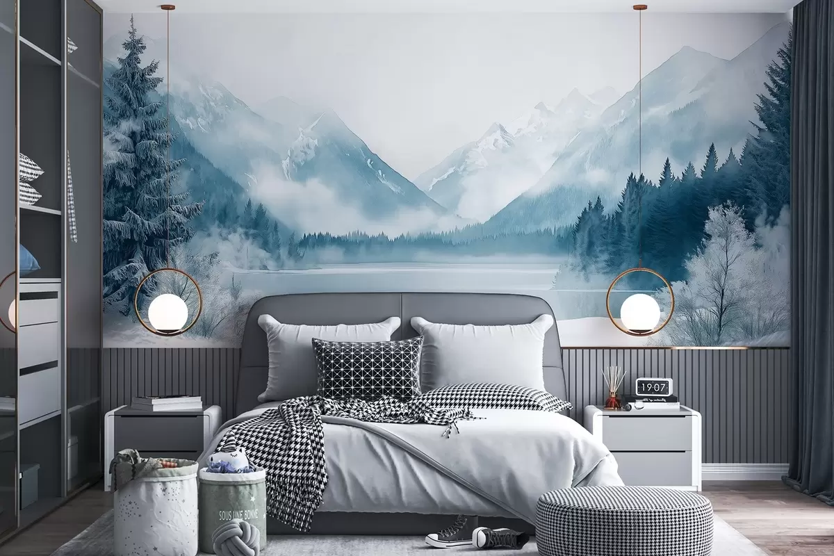 Fototapety Zimné hory, zamrznuté jazero, borovicový les, modrá paleta farieb, akvarel Nr. w02354