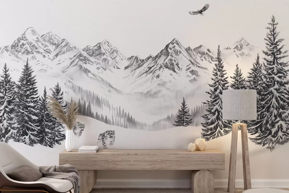 Fototapety Zimné hory, snehové leopardy, borovicový les, kresba ceruzkou, letiaci orol Nr. w02360