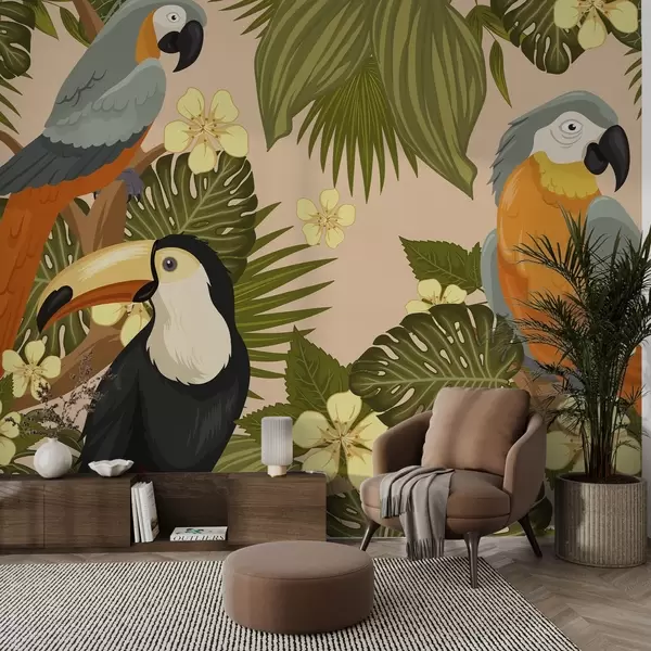 Fototapety Žiarivé papagáje a tukan v žltej farbe Nr. w02365