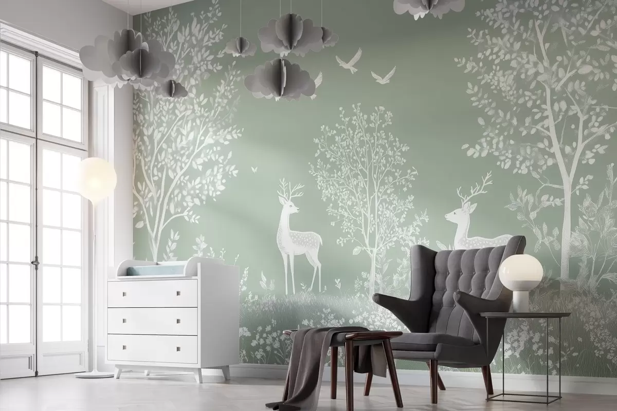 Fototapety les s jeleňom v štýle kresby kriedou na zelenom pozadí Nr. w02444