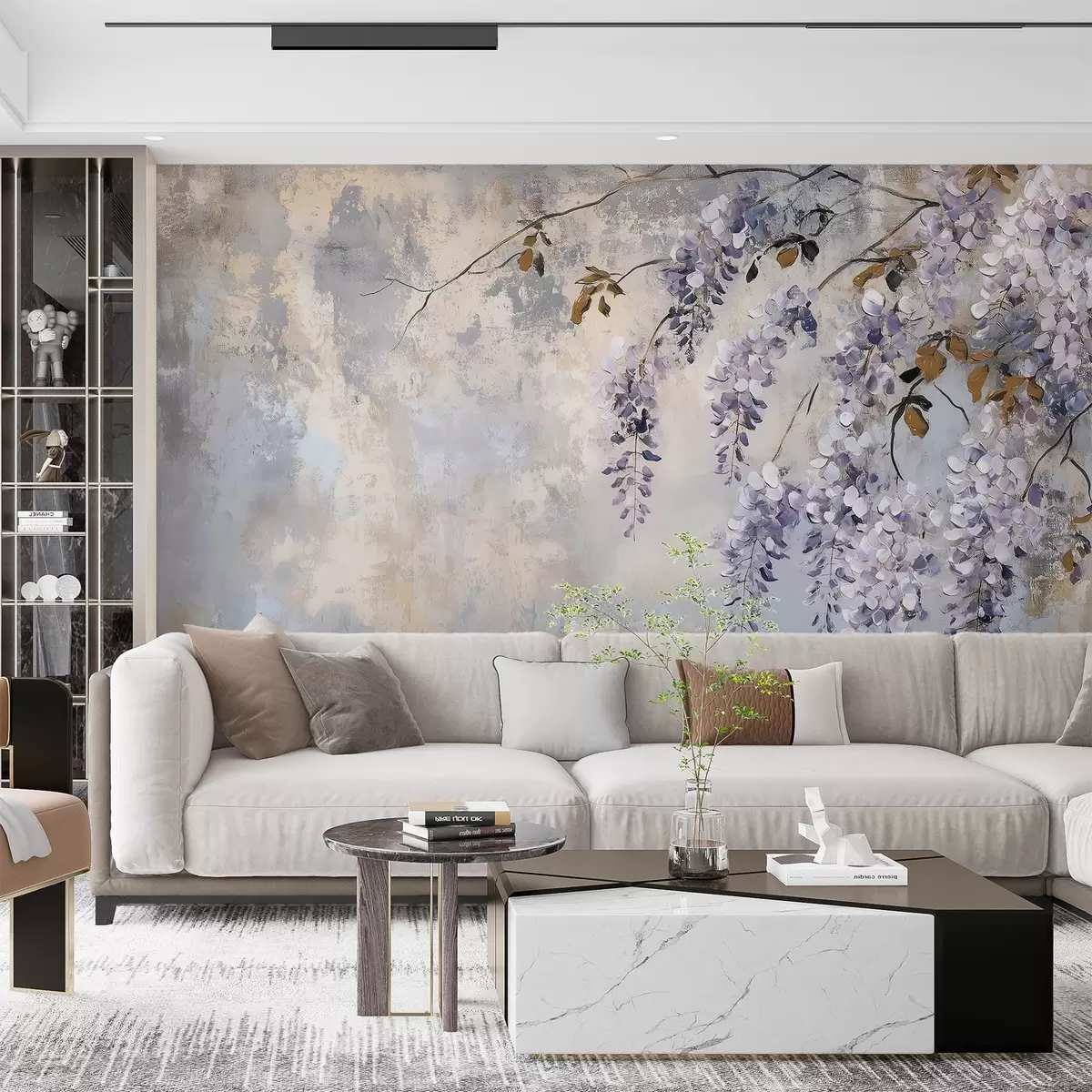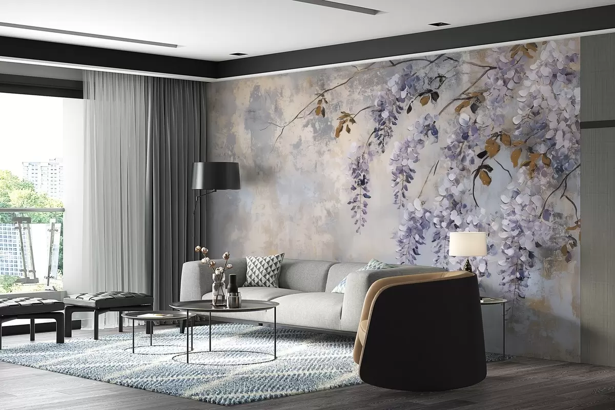 Fototapety textúrovaná tapeta v jemných, tlmených farbách s jemnými kvetmi a vetvičkami vistárie. Nr. w02451