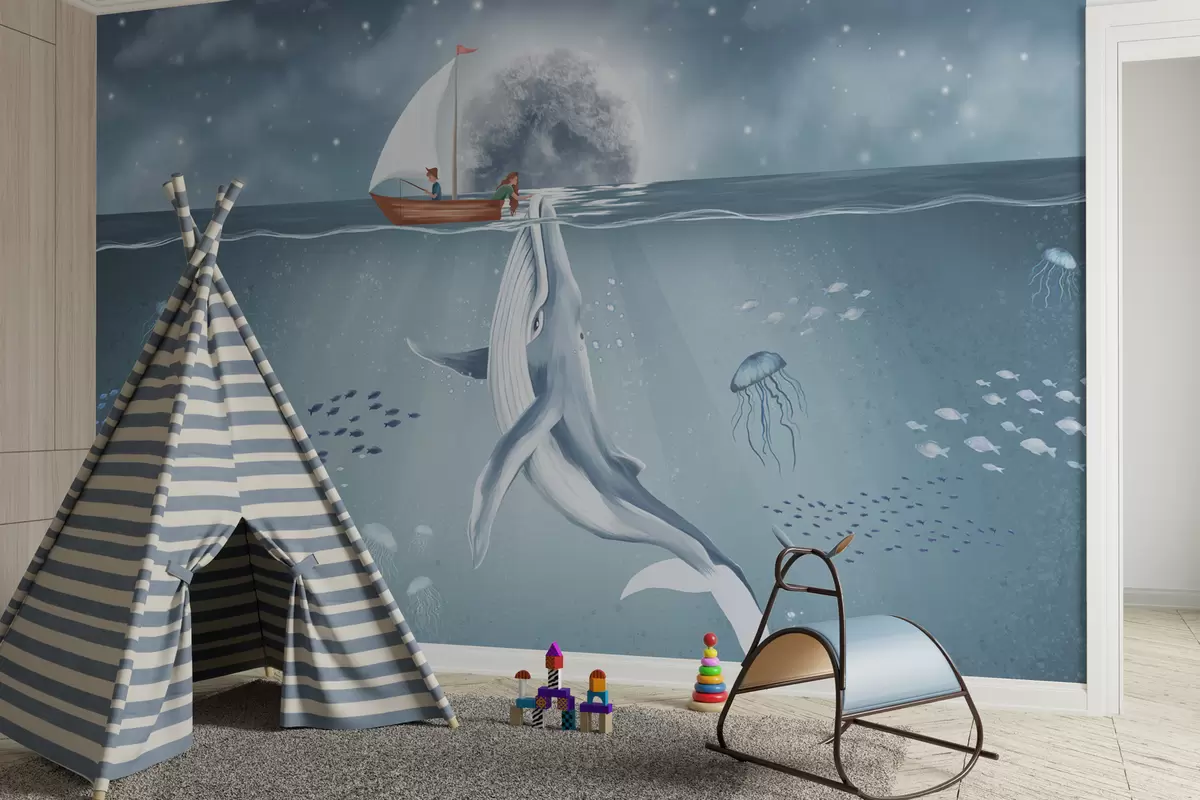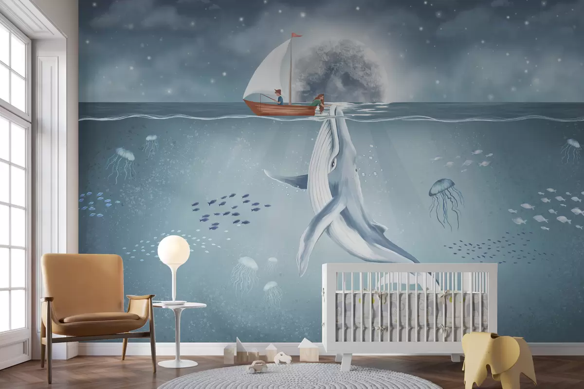 Fototapety Detský dizajn s veľrybou, mesiacom a loďou s deťmi Nr. w02476