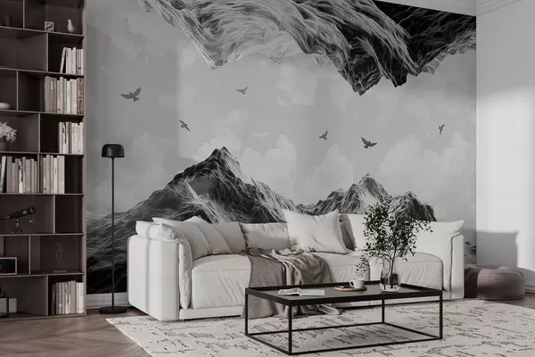 Fototapety Hory krajina, realizmus, lietajúce vtáky, príroda, mraky, čiernobiele farby Nr. w02514