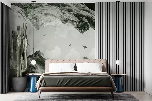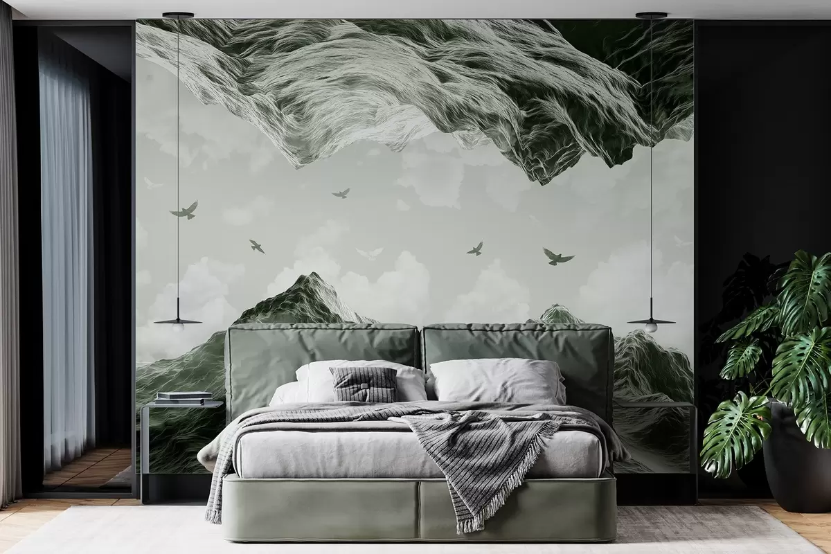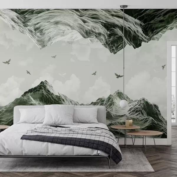 Fototapety Hory krajina, realizmus, lietajúce vtáky, príroda, mraky, zelené farby Nr. w02514v3