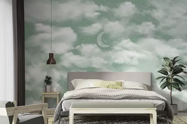 Fototapety Hviezdna obloha s mesiacom a mrakmi, zasnená, éterická, jemné zelené farby Nr. w02515v2