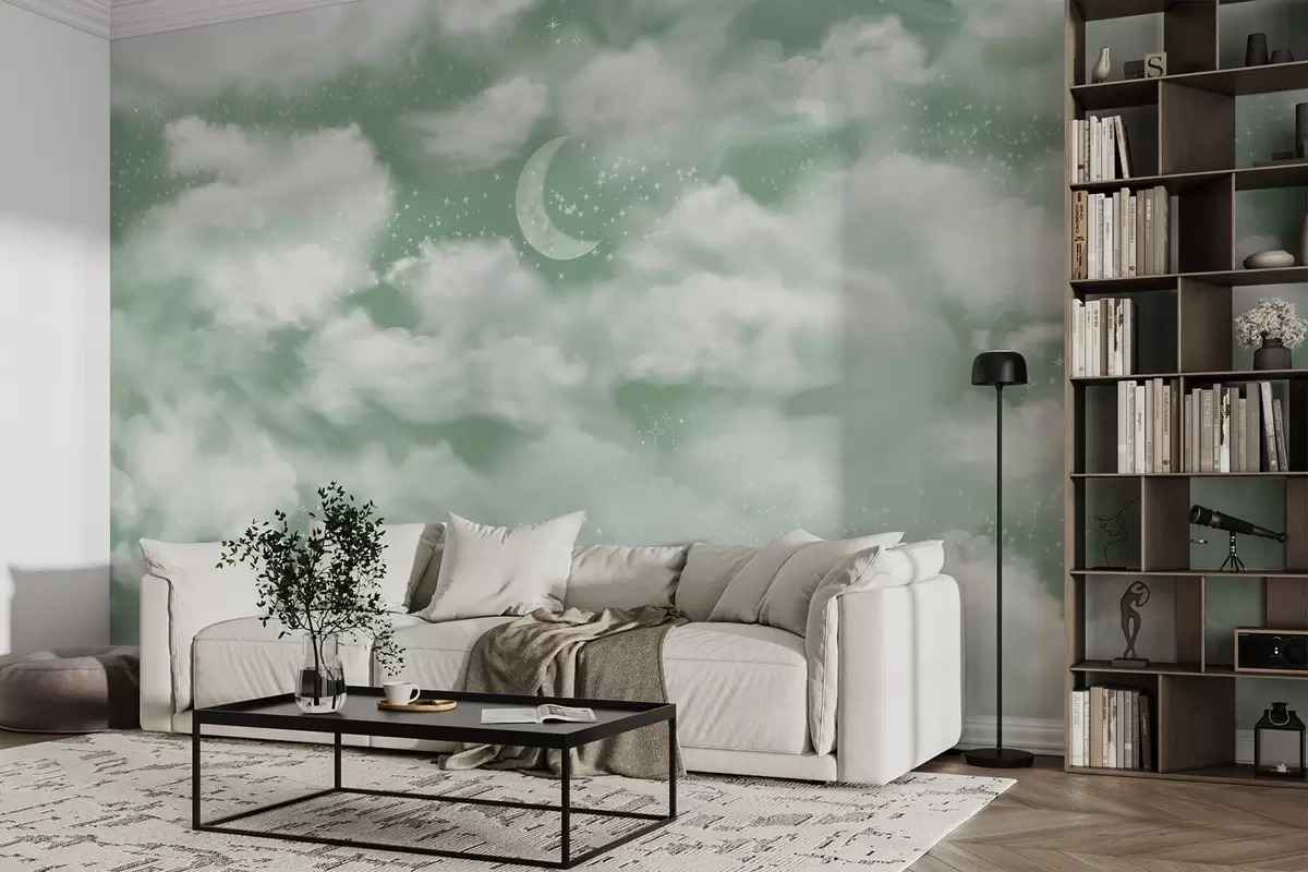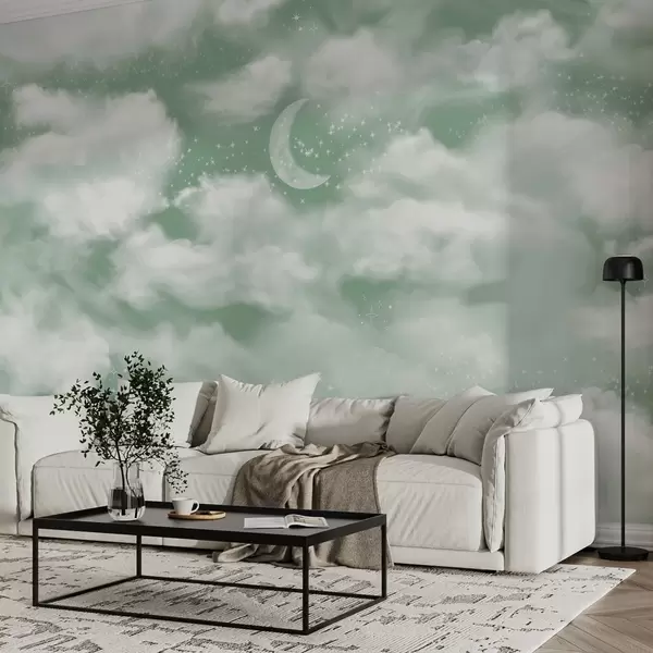Fototapety Hviezdna obloha s mesiacom a mrakmi, zasnená, éterická, jemné zelené farby Nr. w02515v2