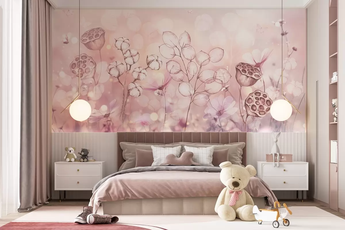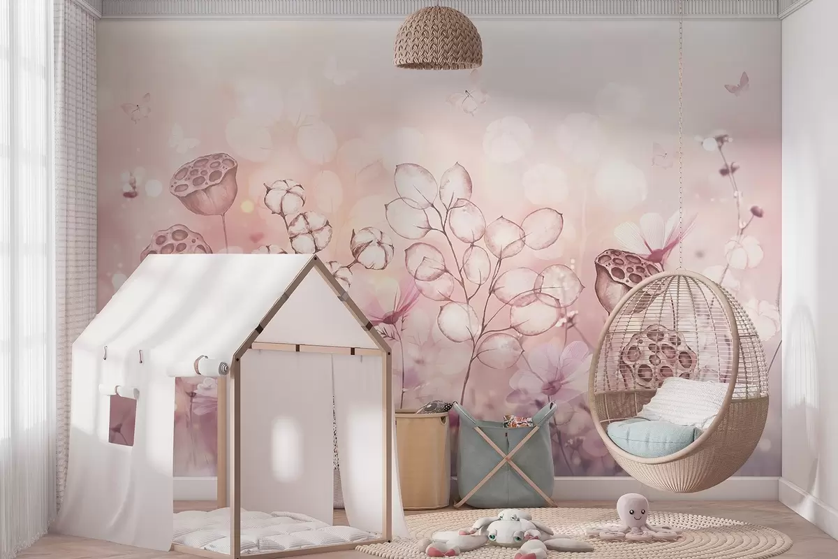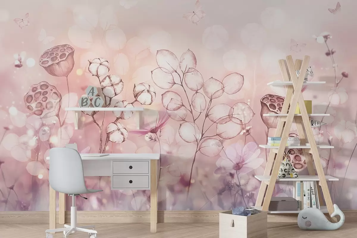 Fototapety Zasnená kvetinová záhrada, motýľ, bavlnené kvety, lotosy, ružové farby Nr. w02516