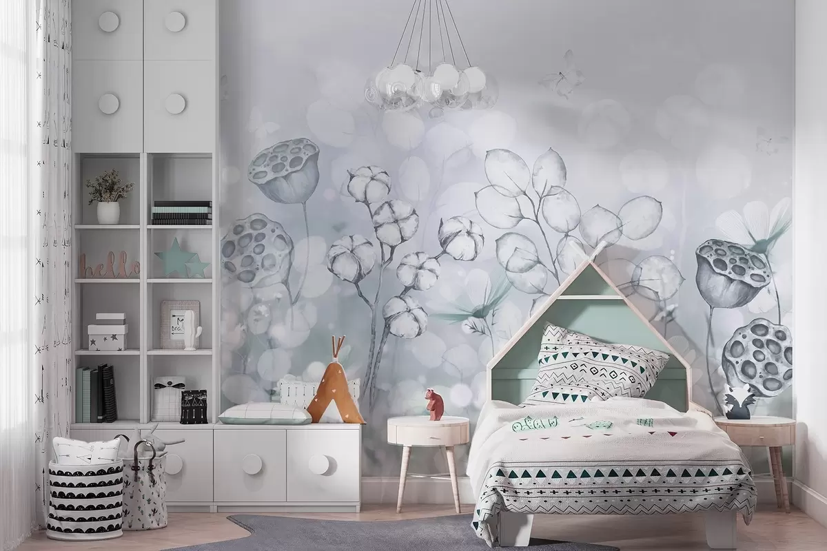 Fototapety Zasnená kvetinová záhrada, motýľ, bavlnené kvety, lotosy, sivé farby Nr. w02516v2