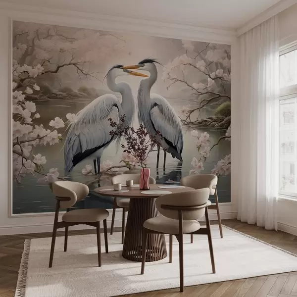 Fototapety Pár bocianov v rozkvitnutej záhrade Nr. w02621