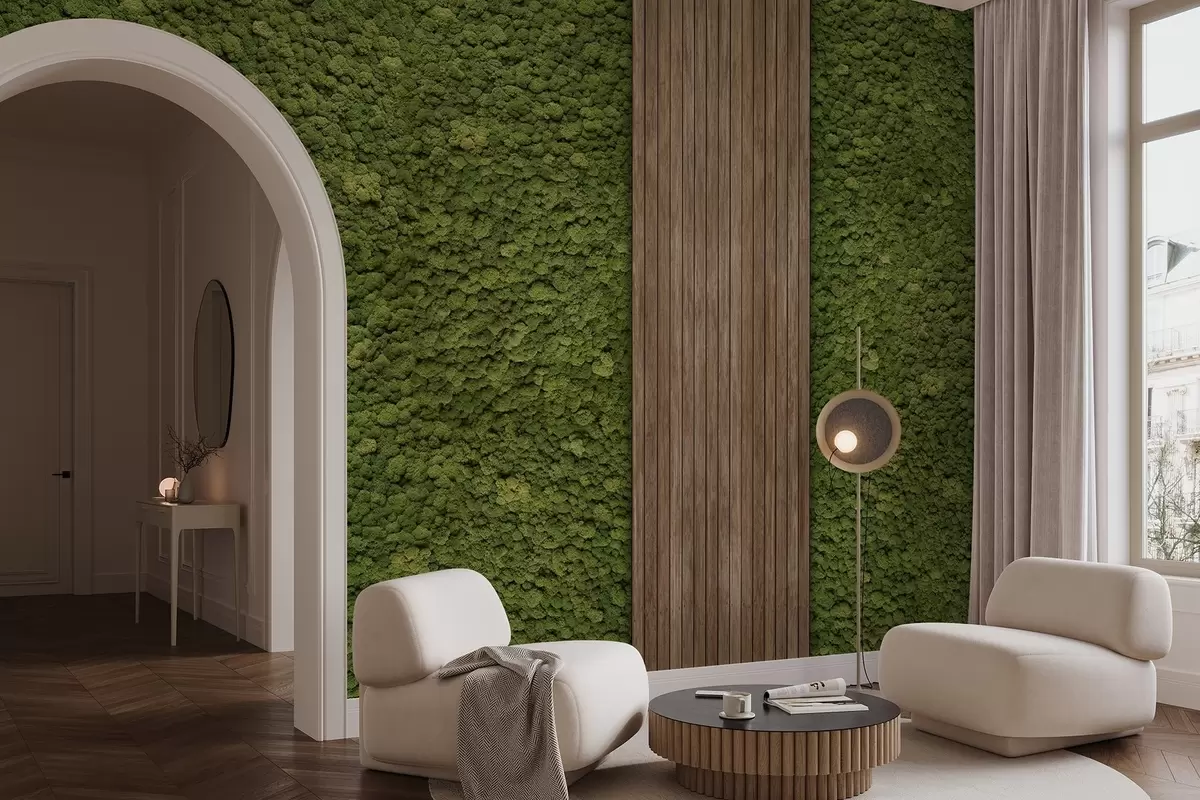 Fototapety Stena v štýle mechu s dreveným panelom, svieže olivové farby Nr. w02656v3