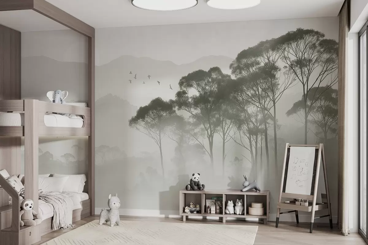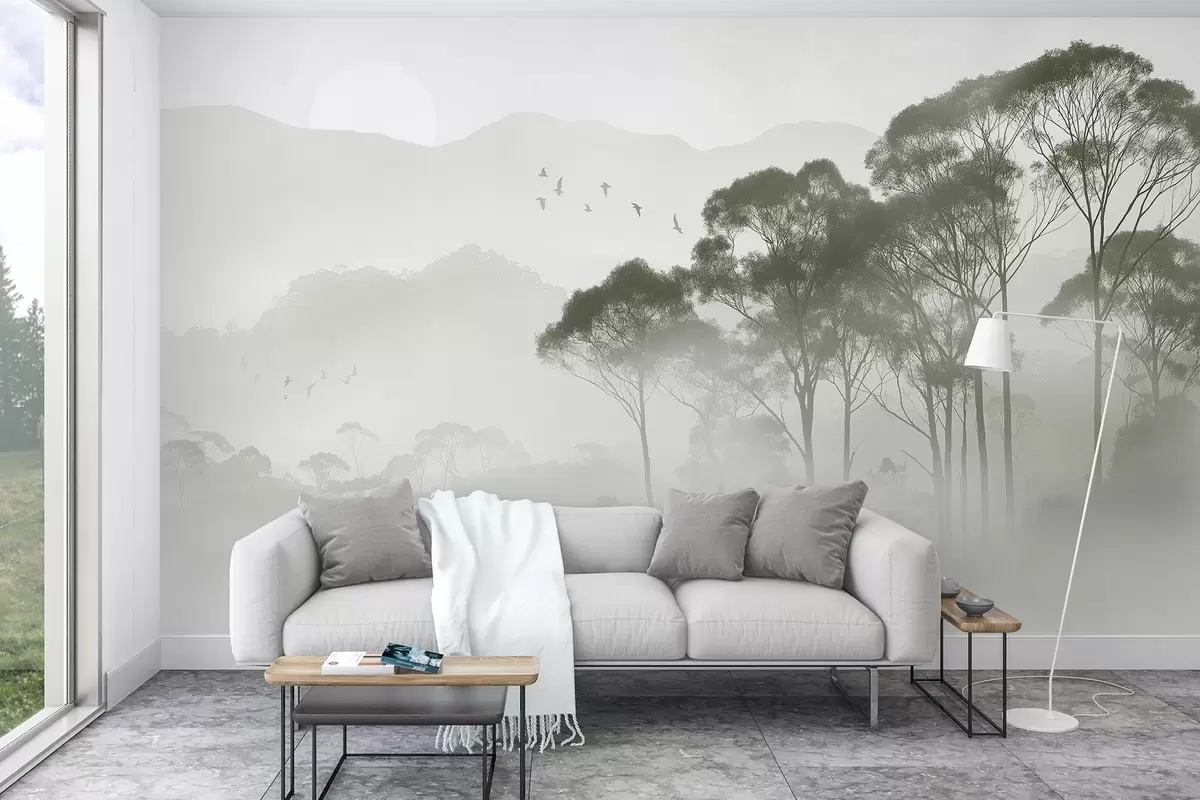 Fototapety Stromy v hmle, príroda krajiny, vtáky, slnko, zelené farby Nr. w02740