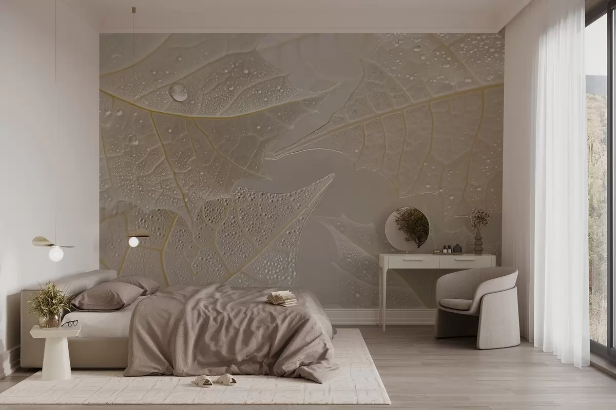 Fototapety Detailný záber na listy so žilkami a kvapkami rosy v béžových tónoch Nr. w02872