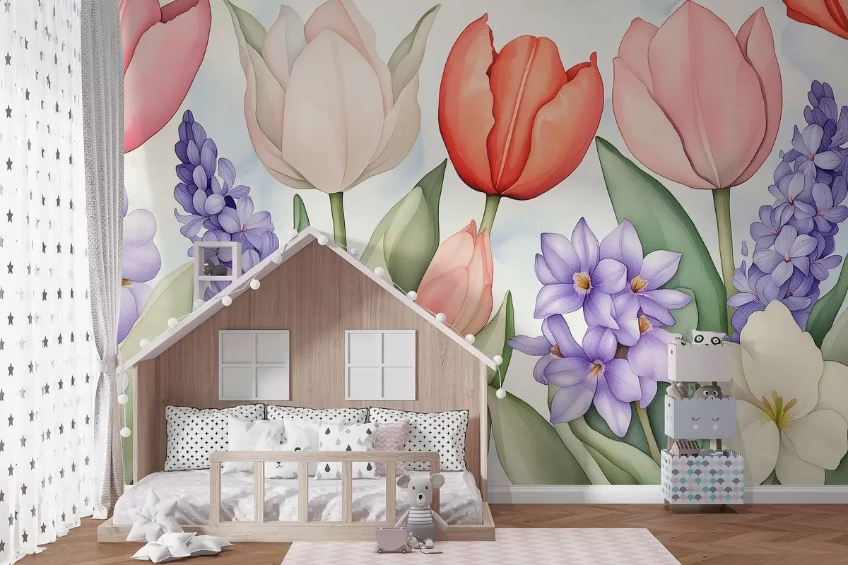 Fototapety Jarné kvety, tulipány, hyacint, akvarel štýl kresby, kvetinové Nr. w02940