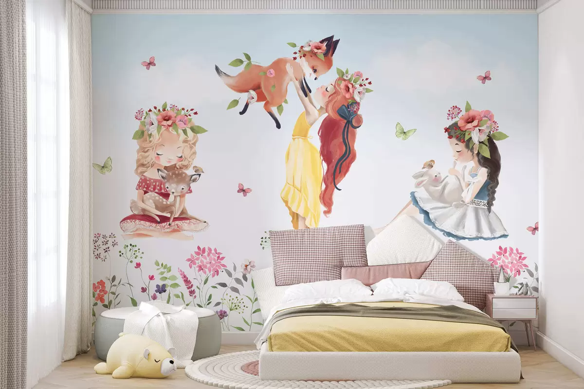 Fototapety Dievčatá s roztomilými lesnými zvieratami Nr. w03002