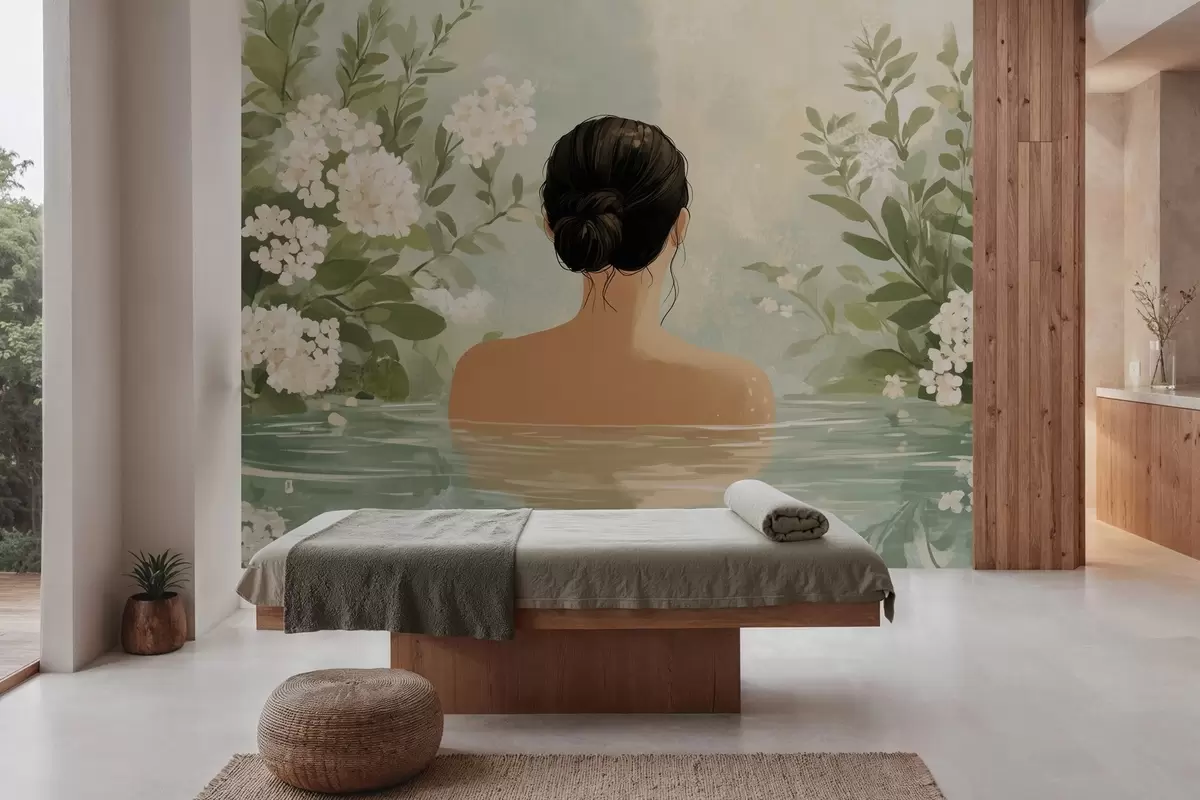 Fototapety pokojná a zasnená botanická ilustrácia ženy kúpajúcej sa v pokojnej, zrkadliacej sa vode, obklopenej sviežou zeleňou a jemnými bielymi kvetmi. Nr. w03014