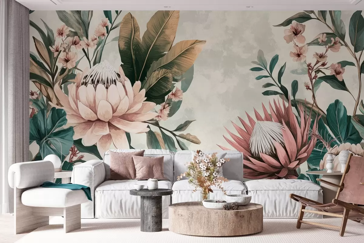 Fototapety exotické rastliny, palmové listy a kvety protey inšpirované vintage Nr. w03015
