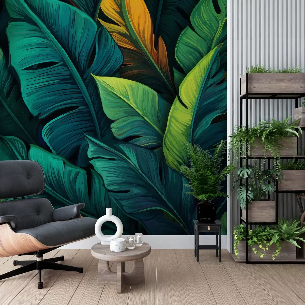 Fototapety Živé tropické listy s tmavozelenými, modrastými a oranžovými odtieňmi Nr. w03078